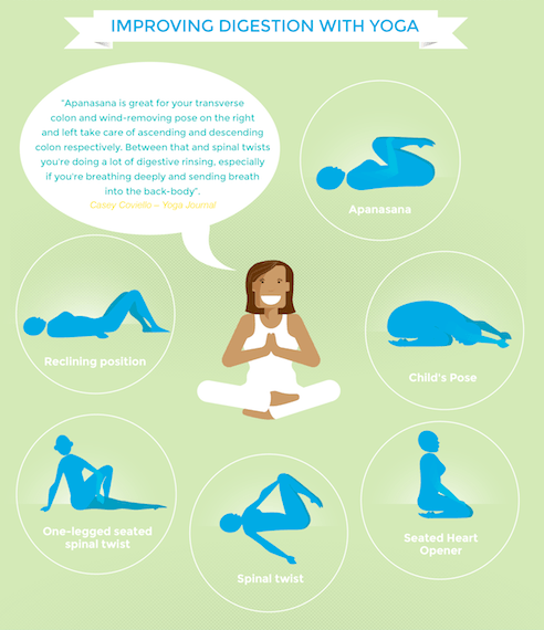 Due to their posture, yoga practitioners have a significantly lower risk of digestive issues. Our digestive system is essentially squashed down and isn’t given the best room to operate when we have poor posture (hunched back, slouched shoulders). In order to promote general digestion, we should open up our shoulders and straighten our back, especially during and immediately after eating, to create enough space for our digestive organs and to avoid applying additional pressure.